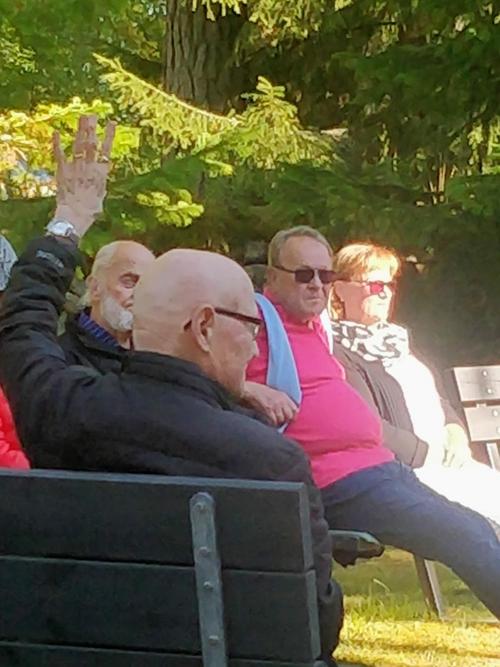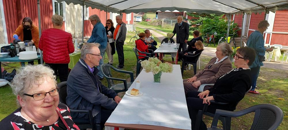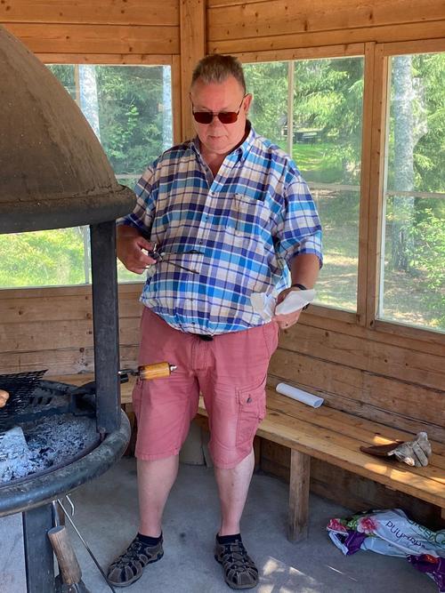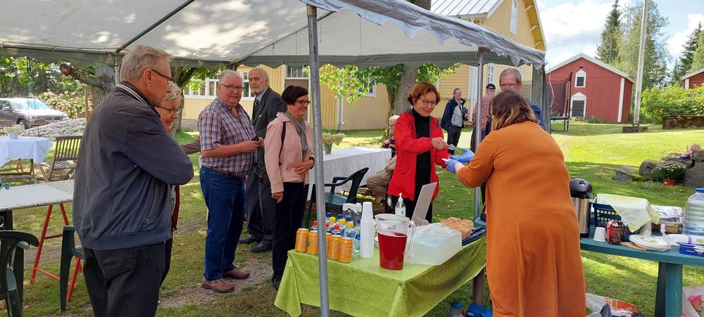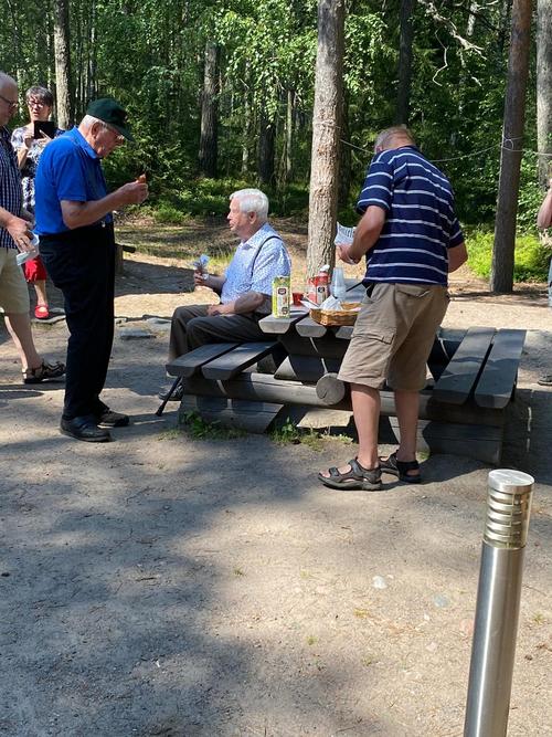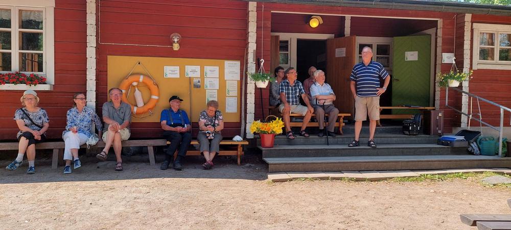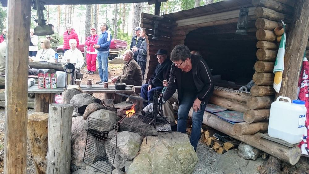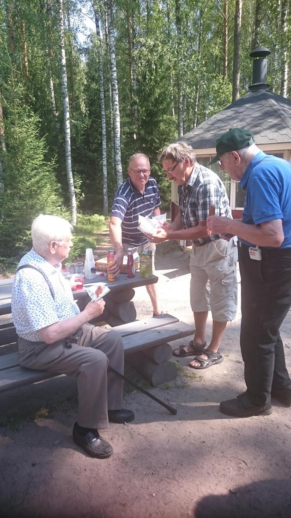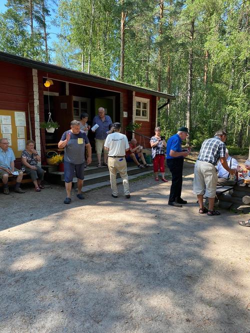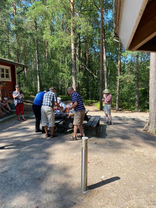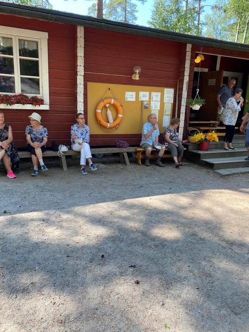 Rantaan saapui runsaat parikymmentä senioria helteestä huolimatta. Kahviteltiin, paistettiin makkaraa, seurusteltiin, saunottiin ja rohkeimmat kävivät uimassa lämpimässä lammessa. Kuultiin Reino Kallion muistelot lapsuuden maisemista ja uintipaikasta. Torsti soitteli hanurilla yhteislauluja ja meillä kaikilla oli niin mukavaa.