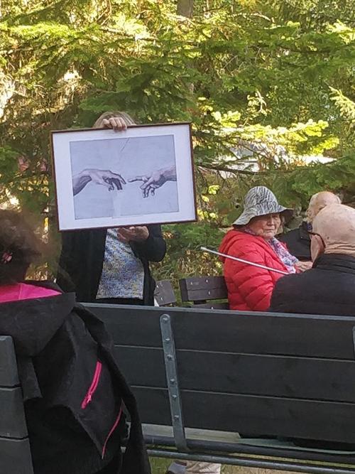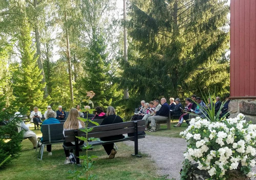 Ke 21.7. Kesäillan iltahartaus Karinaisten kirkon pihapiirissä. Rovasti Jouko Kyyrö johdatteli meidät Sikstuksen kappelin tunnelmiin kertoessaan Michelangelon kuuluisista freskoista. Hartaushetken jälkeen pitkästä aikaa vilpoisessa kesäillassa lämmitti kahvikupponen herkkuineen.