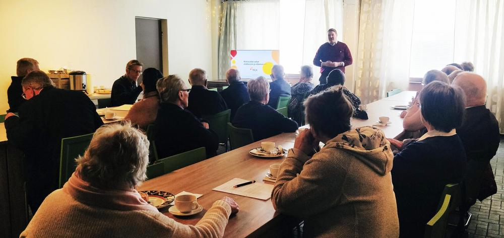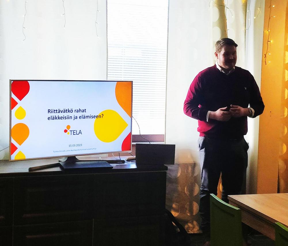 Kokousvieraaksi saimme yhteiskuntavaikuttamisen asiantuntija Turkka Sinisalon TELAsta ja hän kertoi meille tulevaisuuden näkymiä, miten rahat riittävät elämiseen ja eläkkeisiin.