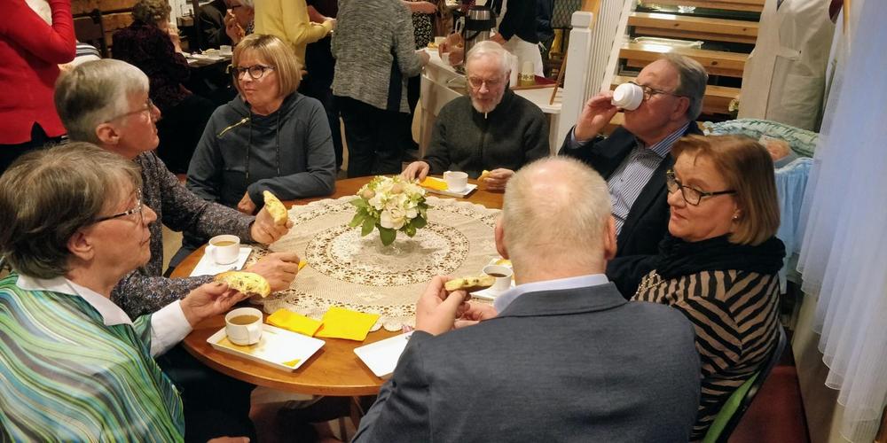 Oli Auranmaan senioreiden vuoro hoitaa kahvitus Kesäillan hartaushetkessä Karinaisten kirkonmäellä. Sateen ripsutellessa siirryttiin sisälle kirkkoon ja kahvit juotiin sopuisasti kahvituvalla. Tänään vietetään myös Suomen kuvataiteen päivää ja kirkossa saattoikin ihailla Wäinö Aaltosen maalaamaa alttaritaulua sekä sankarihaudalla aina niin vaikuttavaa Suru-patsasta.