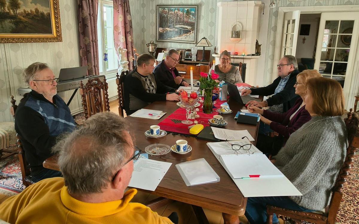 Pöydän ympärillä vasemmalta Simo Tapani, Pekka Riitamo, Tapani Kaukovalta, Maire Toivonen, Jarmo Sinisalo, Iiris Toivonen, Merja Sinisalo, Heikki Isotalo (selin), kuvaajana Heli Laine